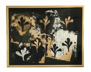 The artist’s complementary and tonal palette abstracts her landscapes, while her fluidity of brushstrokes and layers of pigment show her painterly printing style. In Adams’s reverse glass painting we see biomorphic shapes, and the application of gold and silver leaf in antique mirroring techniques used in a way which speaks to her printmaking work.