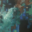 “This series was created while listening to a friend’s music and was a response to his newest album. The style was inspired by my desire to experiment with abstraction and relates to a series of paintings that started with the view from the window of an airplane. I work with color, bound by shape, and punctuated with dots and dashes to create an energy that flows from the canvas and embraces the vitality of nature.
