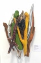 I began my assemblages of found wood 30 years ago, using large pieces of driftwood that I found on the Jersey shore beaches where I lived. Later I bought cedar pieces from landscape design suppliers and partially painted them to overcome the monotony of their uniformly gray color. The Bellows Falls wood gave me a new palette. It came in many colors: silvery grays, charcoal, golden tans and dark brown. I no longer felt the need to paint the wood. It had been stripped bare of its bark by the water and had a sensuous smoothness. I also found it had been ”cured” by its months behind the dam so that it was free of bugs. For the past 20 years I left the wood in its natural state, adding no oil or wax but recently I returned to painting it as well. I look forward each spring to the new “crop” that comes over the dam with a fresh supply of sculptural shapes.