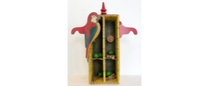 Sloane Dawson works with found objects, creating assemblages which both deny rationale and serve as a studied chronicle of the artist’s self described life of adventure and travel.