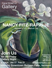 Nancy Fitz-Rapalje, based in Bellows Falls, Vermont, presents three paintings from her “Orchis Quattro” series. In these works, Fitz-Rapalje employs her well known top down perspective, although in these pieces they do have a horizon. The same orchid in bloom is painted from three different angles, and on three different color surfaces, and in three different temperatures and intensity of light. This collection of paintings reveals an intimate view of the solitary life of a dedicated oil painter, observing the everyday objects surrounding her in the studio.