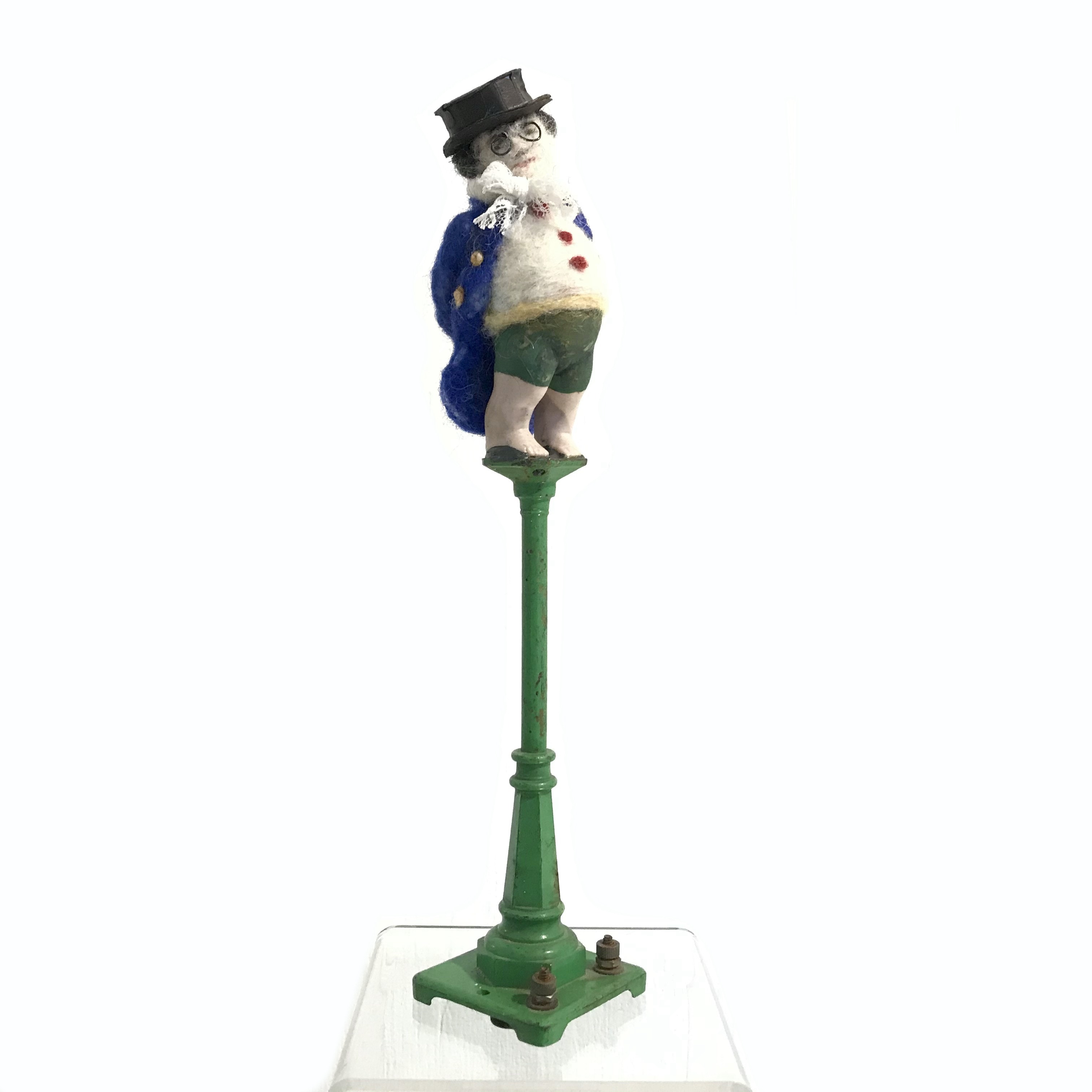 Wool needle felting, acorn caps, grape vine, found plaster statue, acrylics