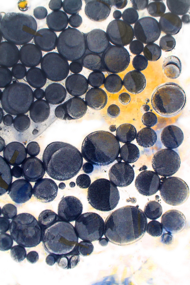 Encaustic medium over birch bark, handmade paper and amaranth dye on basketball gourd