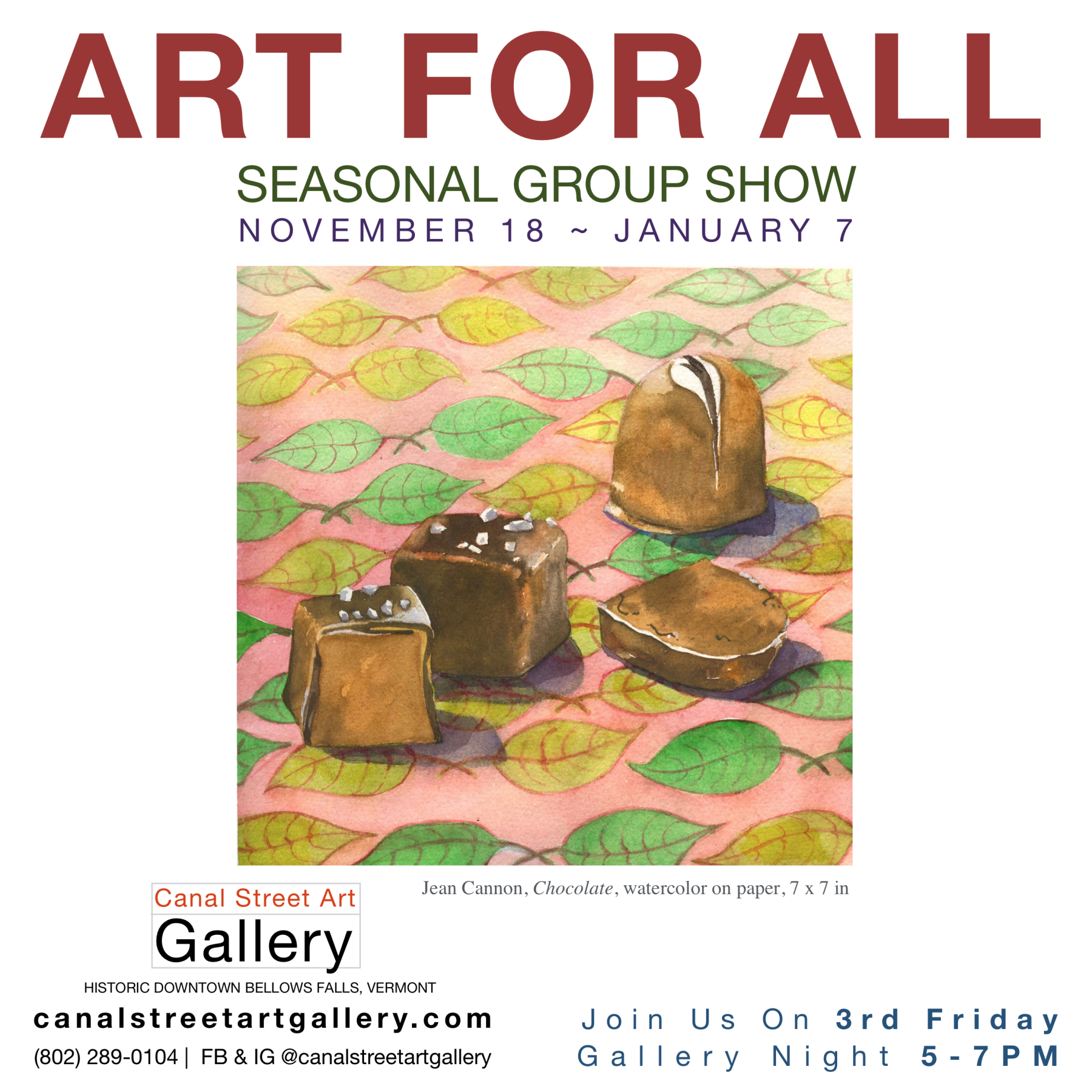 Canal Street Art Gallery presents: the Art For All Seasonal Group Show, sharing the gifts from the many artists of this region, and celebrating the start of the Gallery's sixth year. The show is now open and is on view through January 7th. Join the Gallery on 3rd Friday Gallery Night in Historic Downtown Bellows Falls from 5-7pm on November 18th to attend the Opening Reception for the artists, and again on December 16th for 3rd Friday Holiday Night. All Gallery events are free and open to the public.