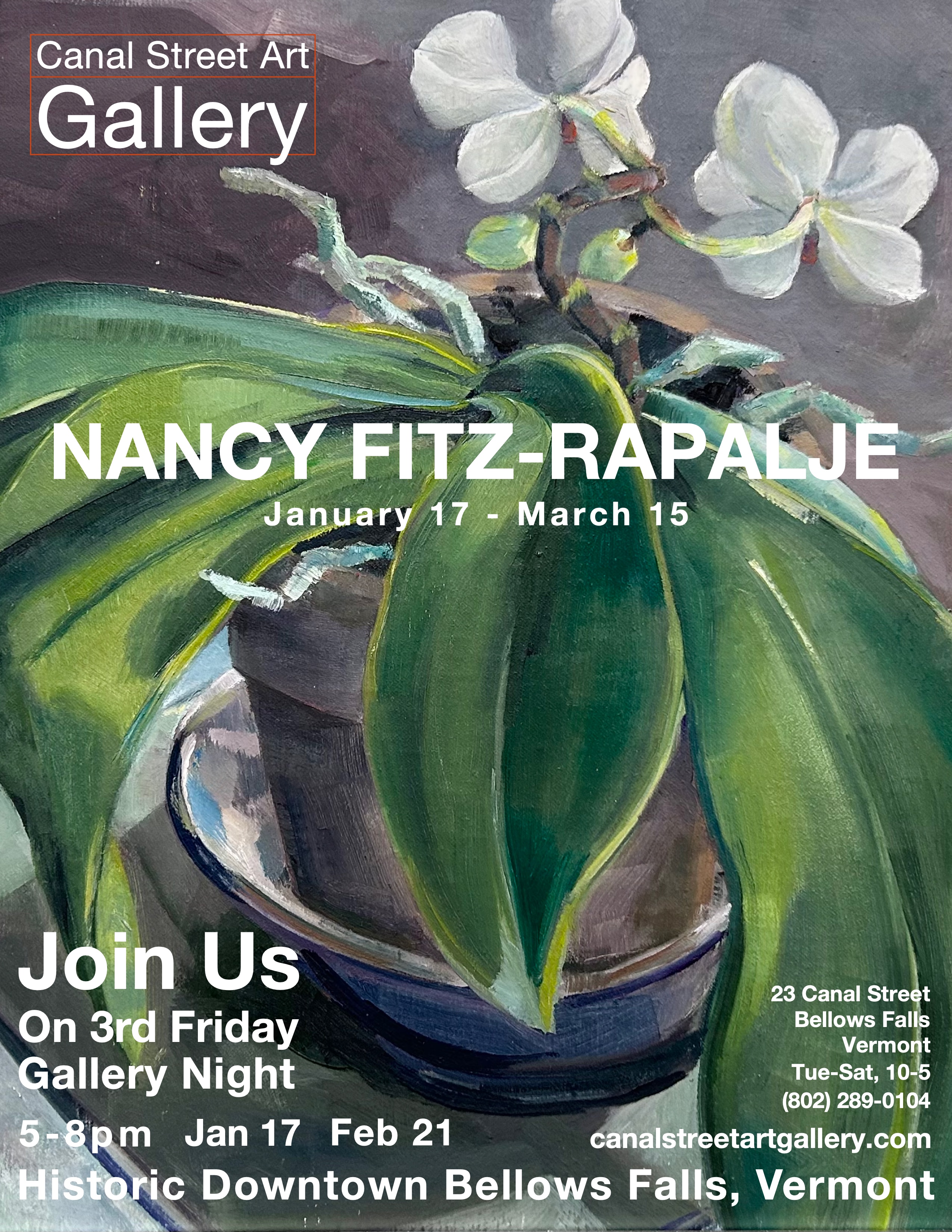 Nancy Fitz-Rapalje, based in Bellows Falls, Vermont, presents three paintings from her “Orchis Quattro” series. In these works, Fitz-Rapalje employs her well known top down perspective, although in these pieces they do have a horizon. The same orchid in bloom is painted from three different angles, and on three different color surfaces, and in three different temperatures and intensity of light. This collection of paintings reveals an intimate view of the solitary life of a dedicated oil painter, observing the everyday objects surrounding her in the studio.