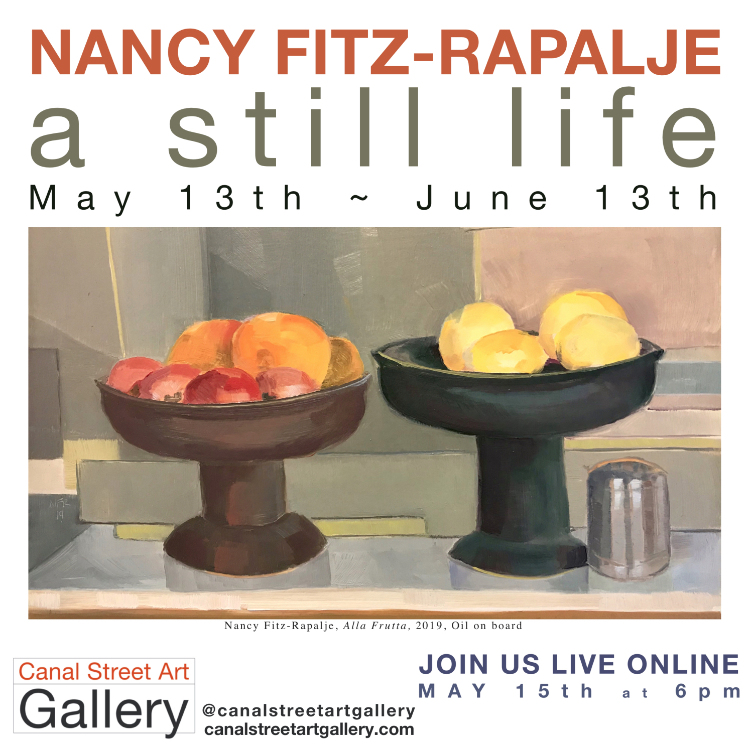 Canal Street Art Gallery presents: NANCY FITZ-RAPALJE A Still Life opens May 13th, on view to the public through June 13th. All are invited on Wednesday, May 13th, to visit the Gallery’s Online Viewing Room, open all the time on it’s website. Go to http://canalstreetartgallery.com to experience the upcoming Represented Artist Show in this new interactive format. We will be LIVE Online May 15th at 6pm for our Virtual Gallery Event on Bellows Falls 3rd Friday Gallery Night! Canal Street Art Gallery is also pleased to now offer Private Appointments, Wednesday to Saturday, 11am to 5pm, during our regular scheduled business hours.