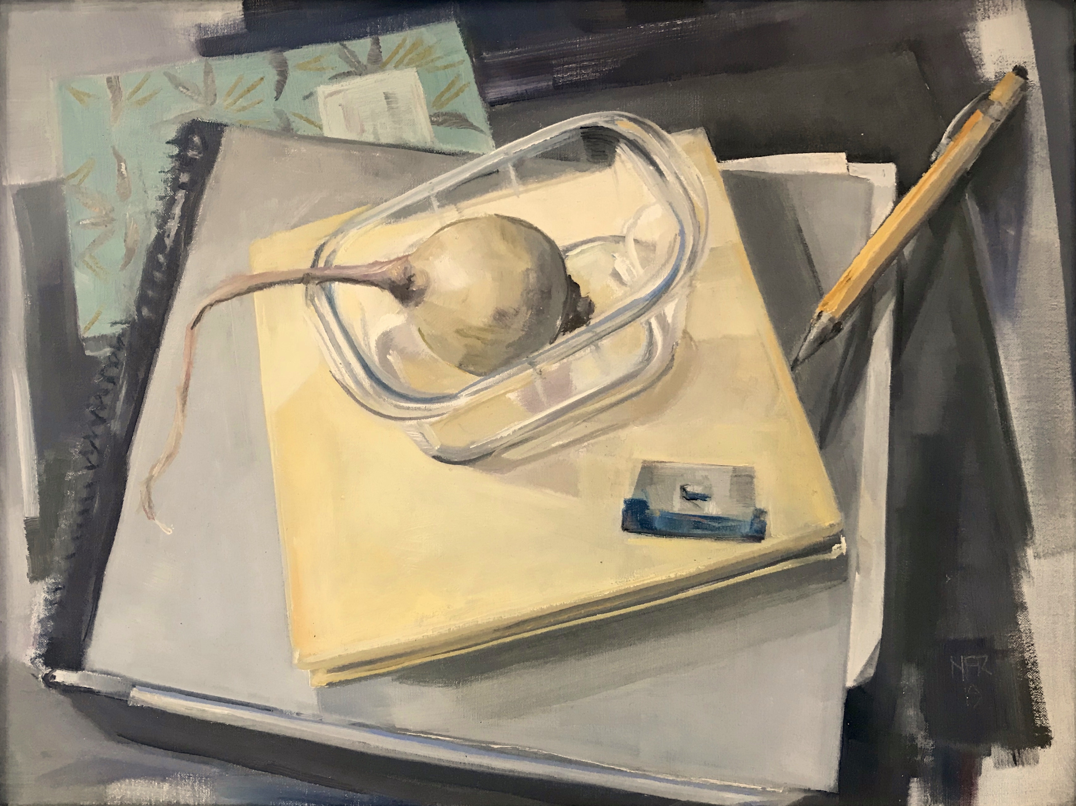 Nancy Fitz-Rapalje, based in Bellows Falls, Vermont, shares new oil paintings in her inaugural Solo Show at Canal Street Art Gallery. Nancy presents paintings from some of her familiar floral still lifes, fruits, and vegetables, done with her calculated, geometric style of brushstrokes. These new paintings focus on intimate details from the artist's life, with paintings depicting sticky-notes, origami, book stacks, color chips, and postcards showing reproductions of artworks from the likes of Braque and Duchamp. To reflect this unique view of the artist’s life, Fitz-Rapalje includes in the show quotes from other artists of importance, in a selection gleaned from decades of reading and saving in her numerous Commonplace Books.
