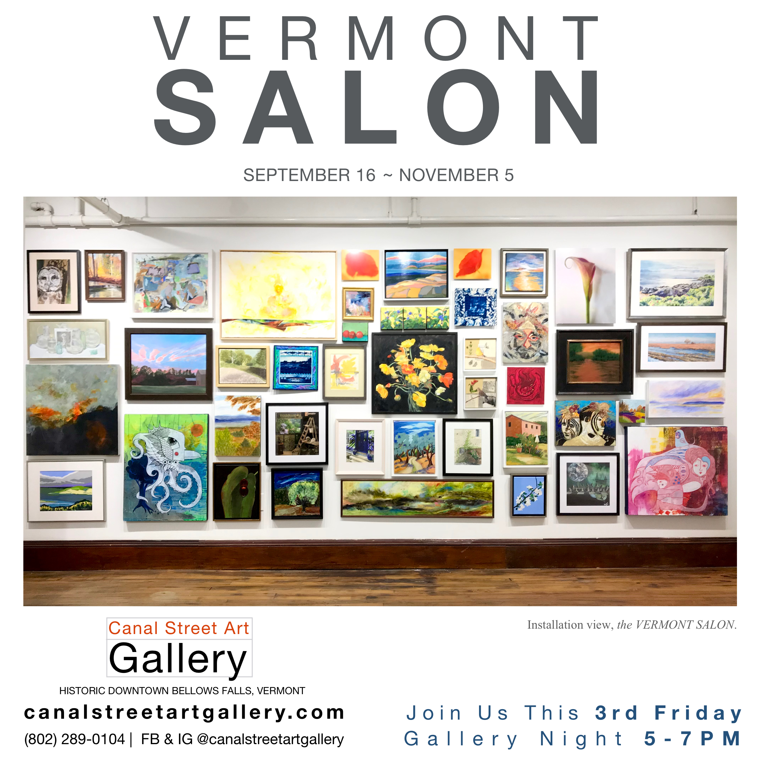 Canal Street Art Gallery presents: The Vermont Salon, a new open call exhibition hung in the floor-to-ceiling Salon style. The Salon opens September 16th, and will be on view to the public through November 5th. Join the Gallery on 3rd Friday Gallery Night in Historic Downtown Bellows Falls from 5-7pm, September 16th, to celebrate and meet the artists. All Gallery events are free and open to the public.