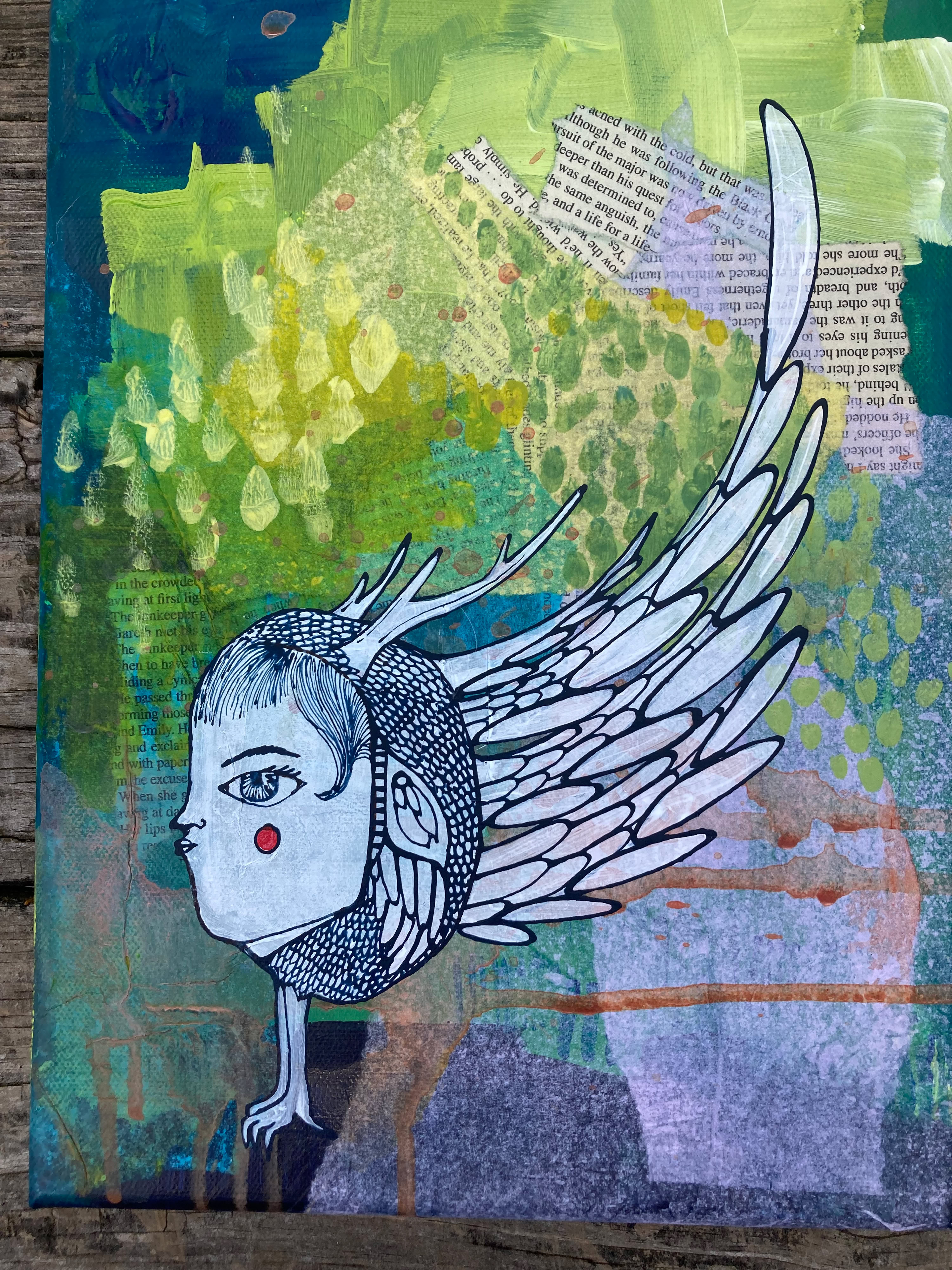 In the artist’s first solo show, Whitney Barrett presents paper collages and mixed media paintings using intricate line drawings of anamorphic female figures along with hand stamped papers, gel prints, colored tissue paper, found words, and book pages from romance novels. These new artworks continue a series Barrett has explored for the past two decades creating visual metaphors to express her main interest: communication.