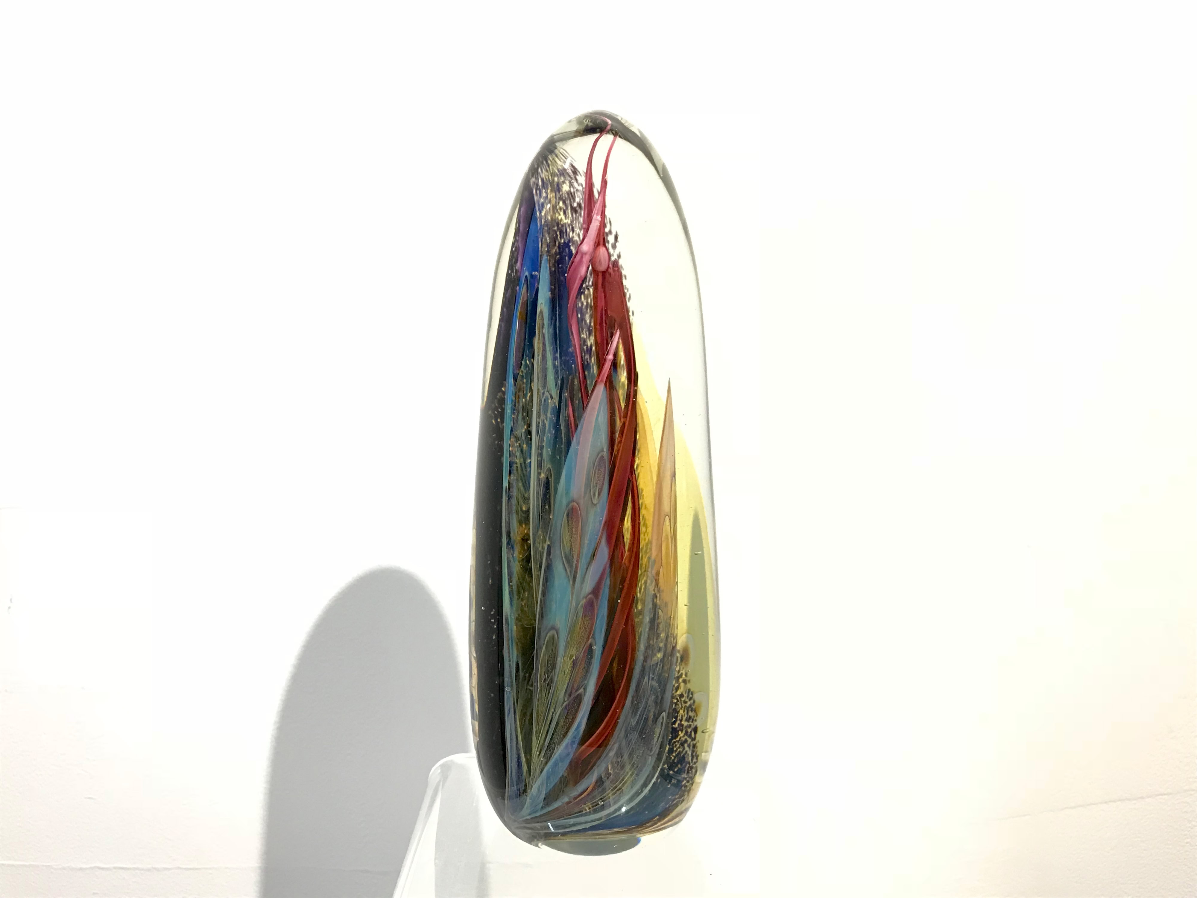 Encaustic mixed media with beads, leaves and peacock feather on flat bushel gourd top
