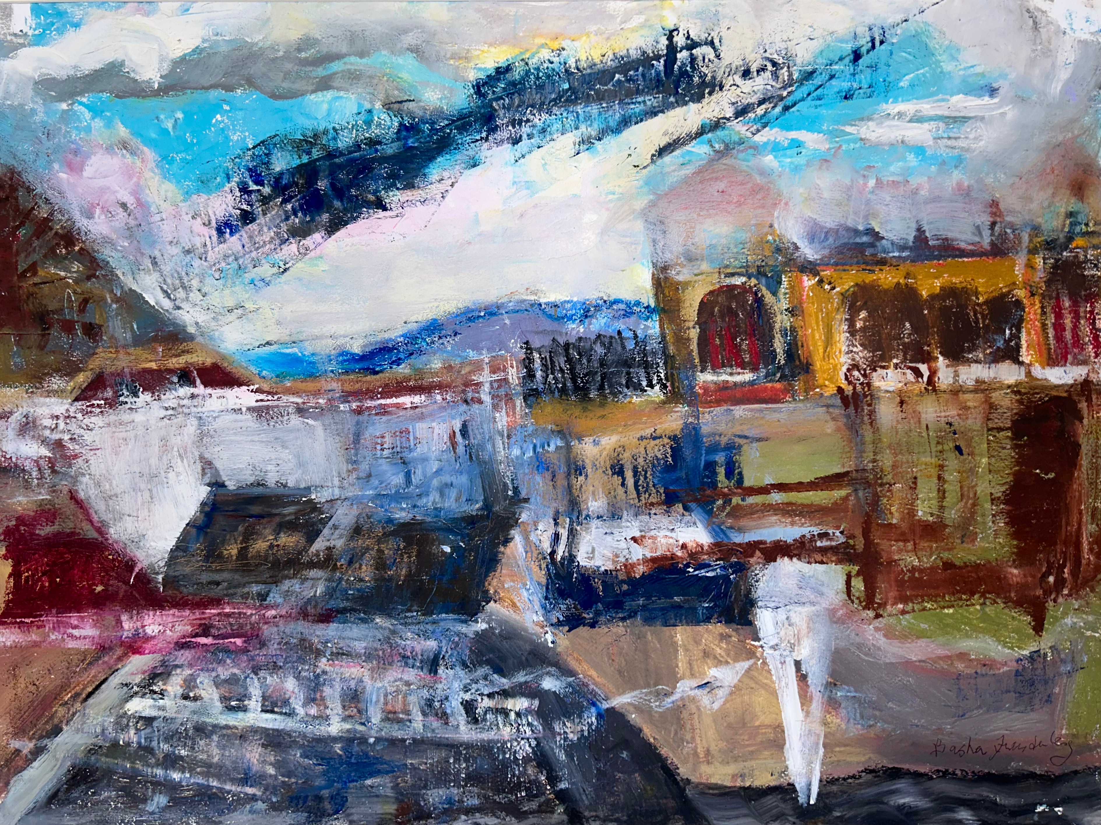Basha Freudenberg, based in Putney, Vermont shares her newest oil paintings, made outside and of the Vermont landscape. Freudenberg, the daughter of two artists, is a ferocious painter, both in her style and prolific creativity. Committed to her plein-air practice, Freudenberg works in the New England elements year-round. In a piece such as “Dummerston Landing”, Freudenberg composes the landscape with seemingly impulsive brushstrokes, working in the light blue of the sky reflected on the river, the dark green and blue tree line and its dark shadow cast on the water. The sun, unapologetically placed in the upper left hand corner of the painting casts repetitive reflections, made in bright yellow and orange. In the foreground are two tree trunks and the near side of the river, in dark red and bright green respectively.