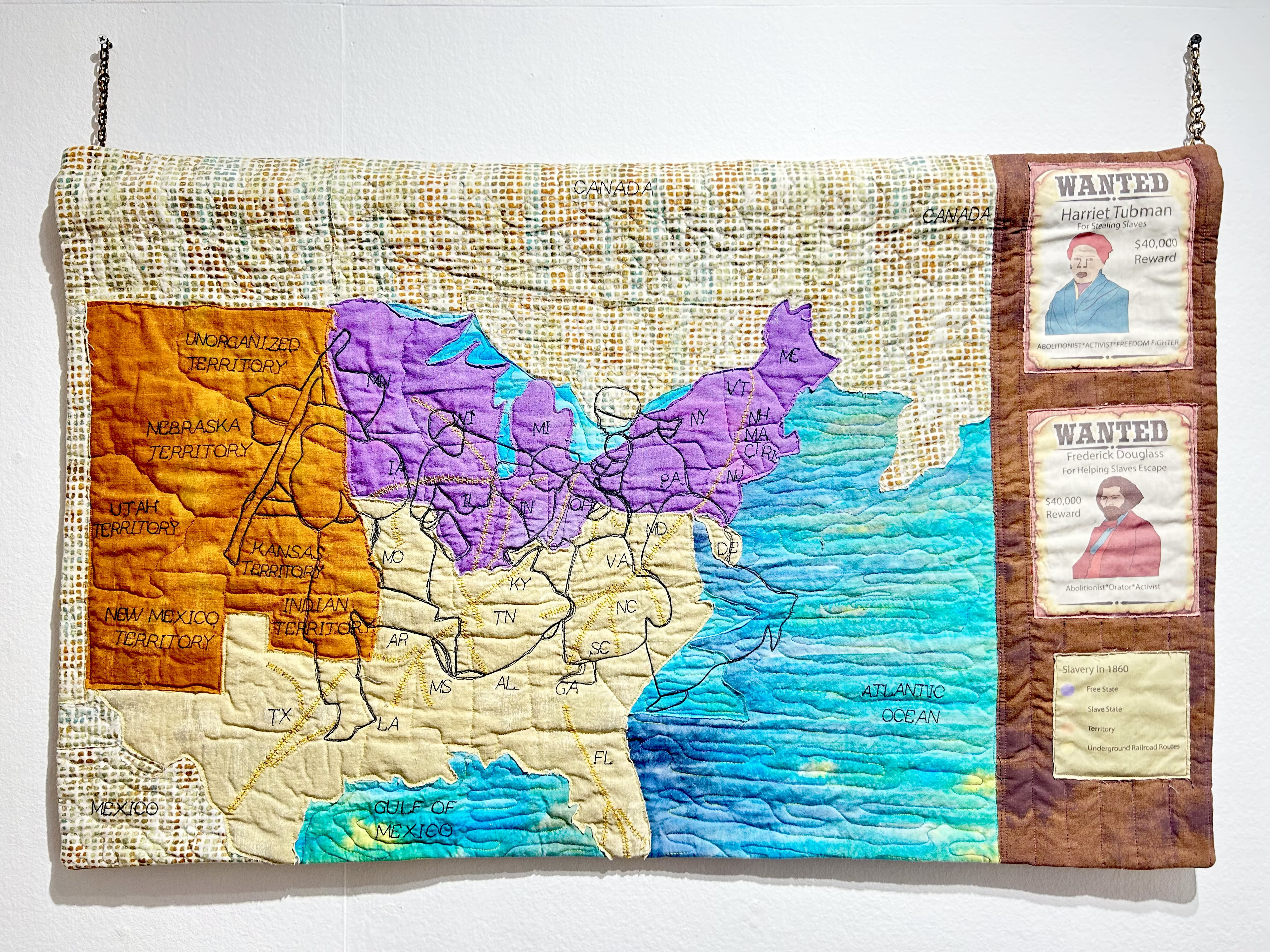 “Escape depicts the underground railroad routes that escaping slaves traveled, from the southern territories to the northern territories. The heroes are not only the escaping slaves but the people, the large network, who risked their lives to help them on their way to freedom.” -Su Lin Mangan