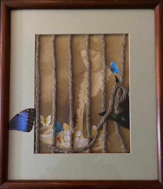 vintage photo, paper, fibers, butterfly wing on cardboard, reclaimed frame