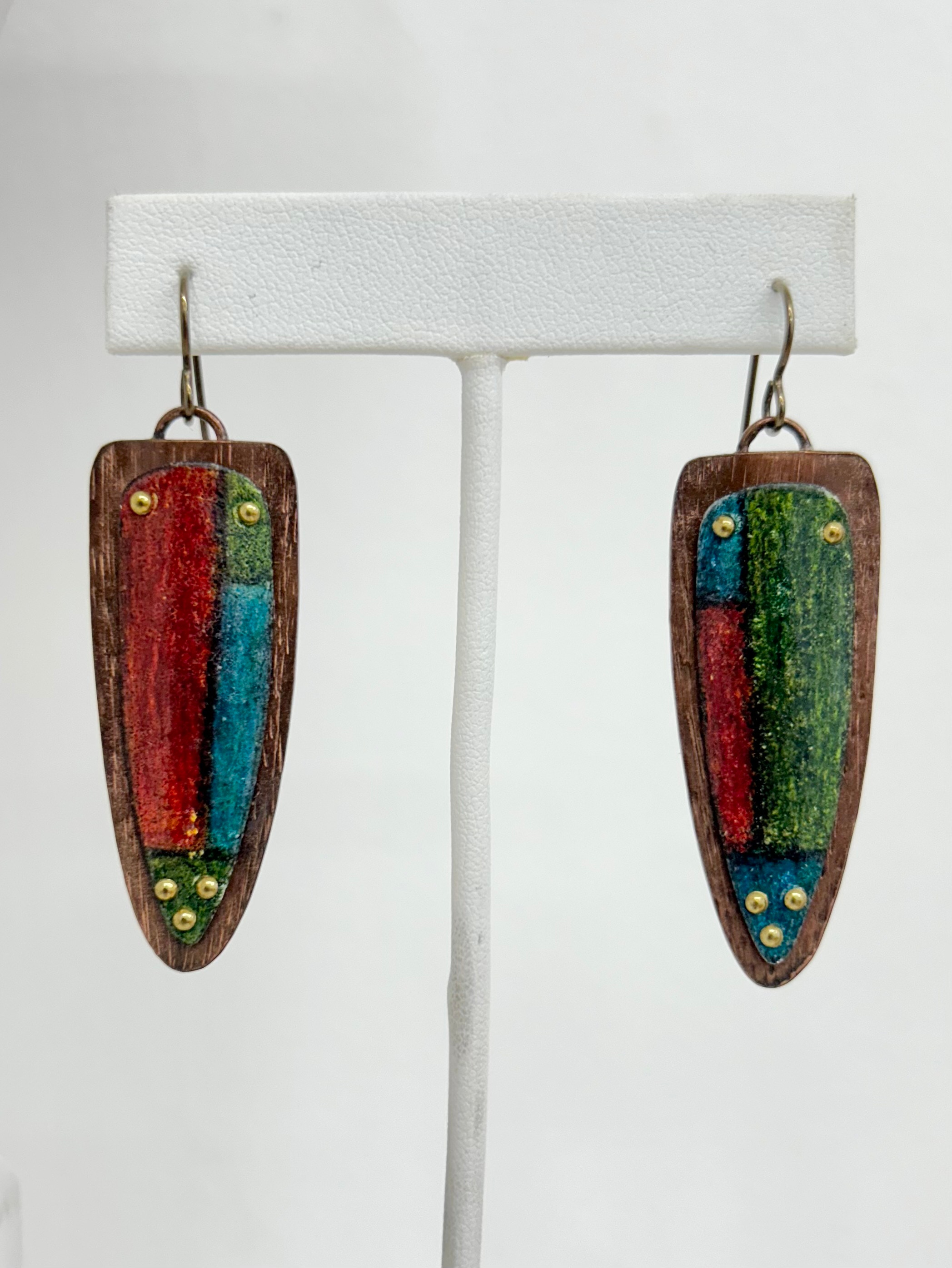 colored pencil on copper, copper; brass rivets, niobium ear wires
