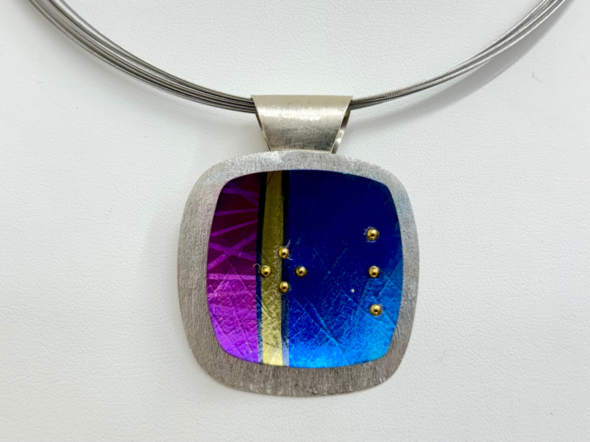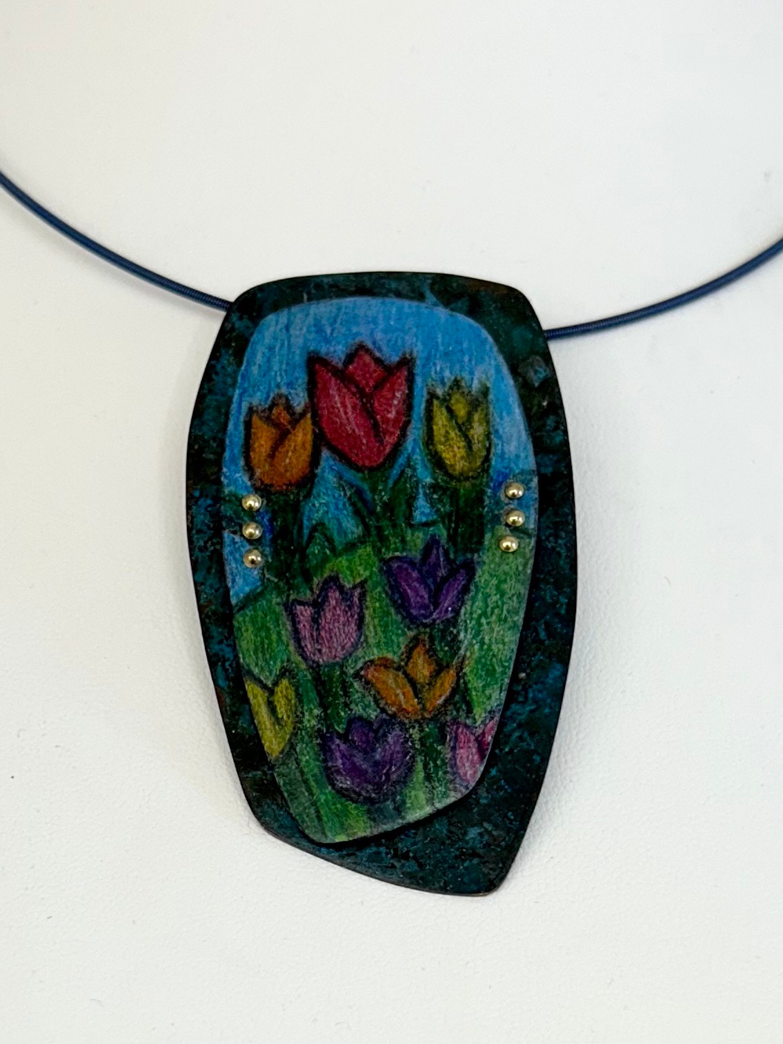 colored pencil on copper, sterling silver, anodized niobium neck wire, magnet
