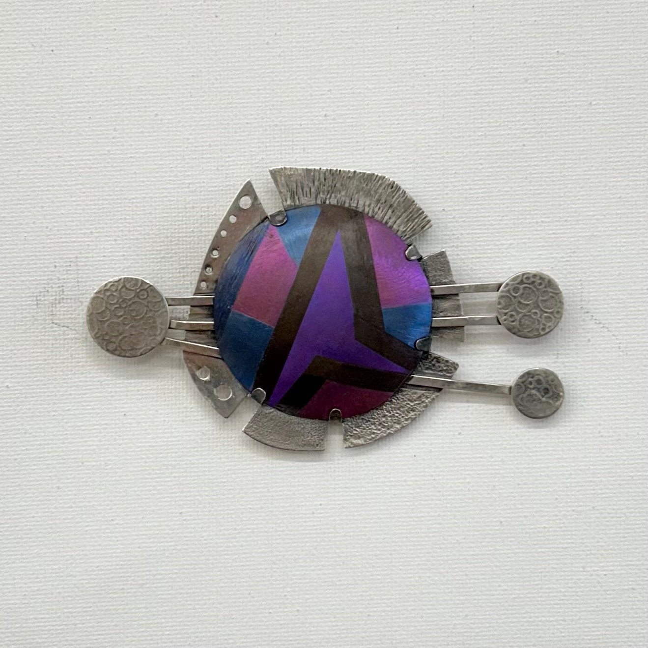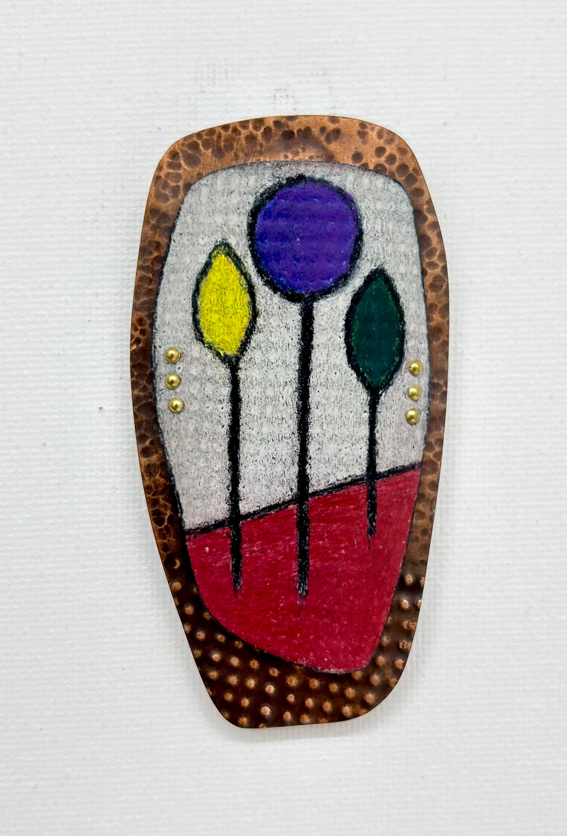 Judi Forman, based in Westminster, Vermont, is a metal artist working with silver, copper, niobium, and steel, using techniques such as anodizing, imprinting texture, and drawing with colored pencil. The artist uses patinated copper with colored pencil along with silver to create works such as “Three Birds Brooch and Pendant” Forman designs compositions often inspired by nature on and with the multiple surfaces she has shaped. Multiple pieces are often riveted together to present the final work. Forman’s most recent work using colored pencil on copper, adds both bright color and texture to the artist’s jewelry.