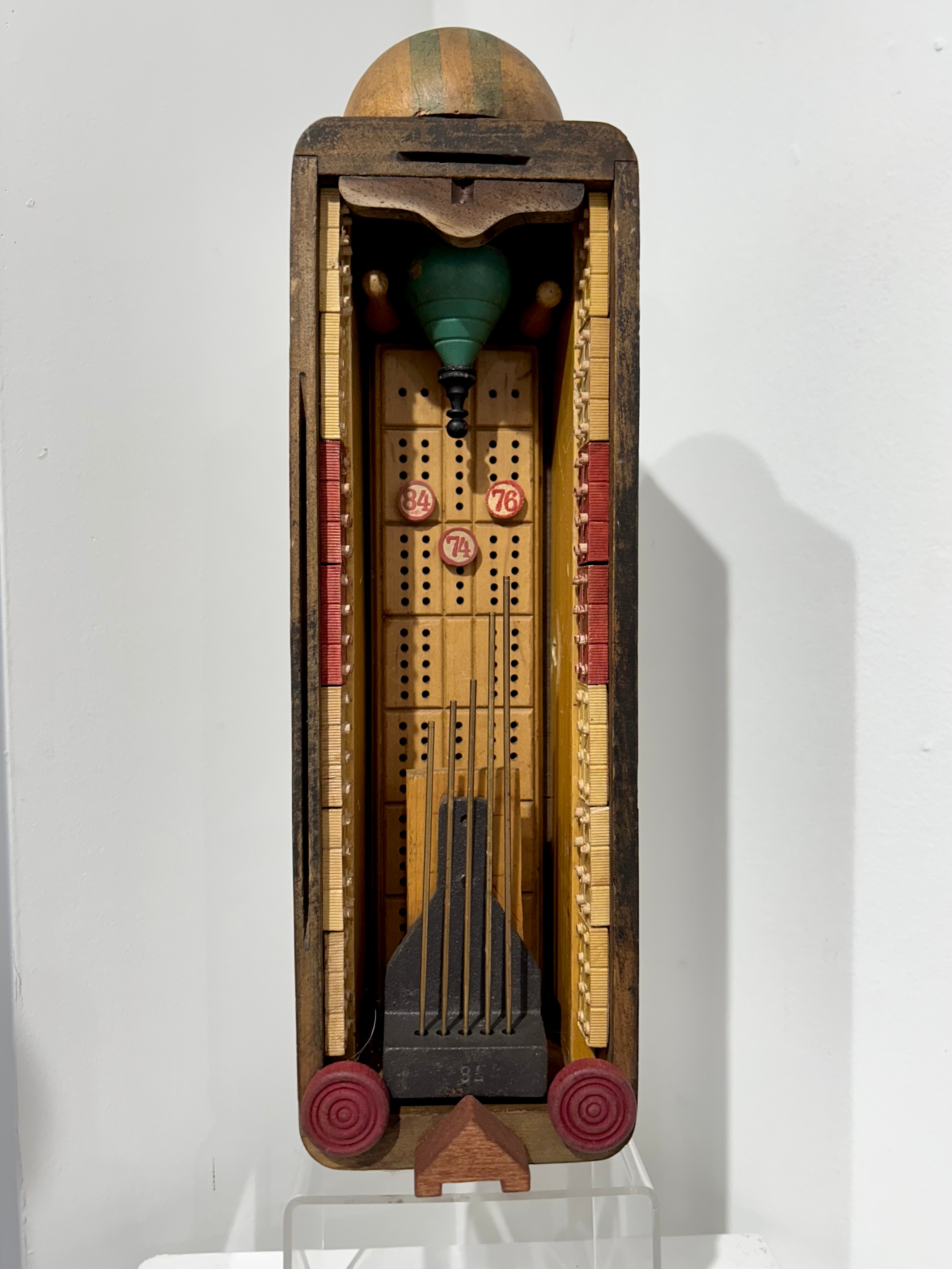 mixed media wood/metal elements from chair, game board, antique radio and typewriter.