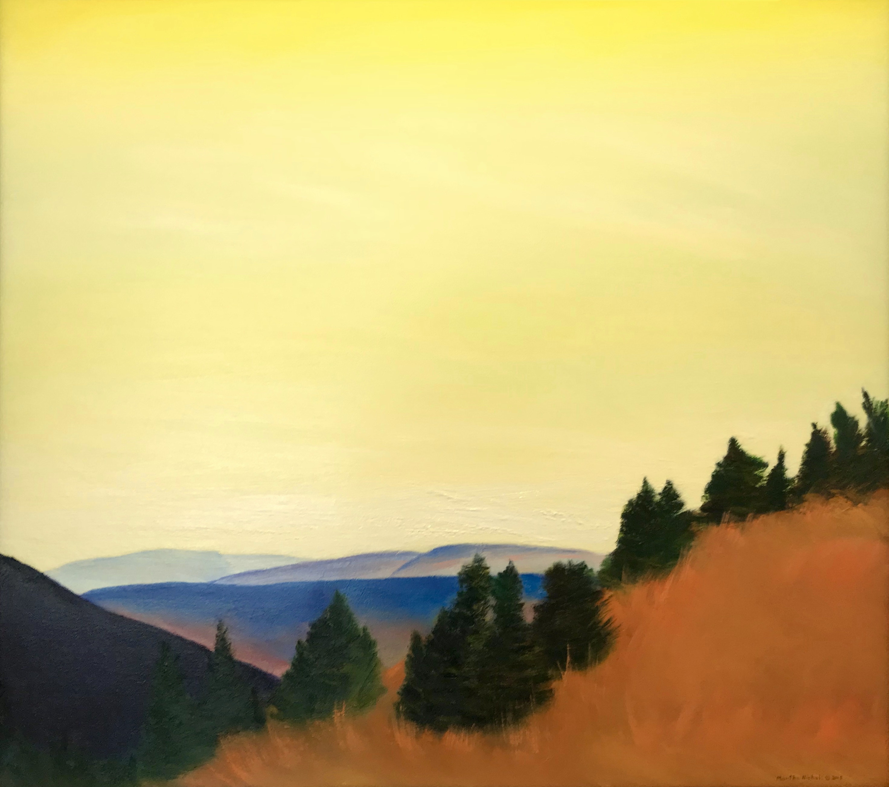 “Color, light and more recently, sound are my primary interests. We are surrounded by ever changing light, color and sound as we go about our days in the landscape. I explore the vast variety of colors which I can mix, and their interactions with each new painting. The elements of the landscape or sky are used as a foundation for the design of each piece. It evolves from there until I am satisfied that some sense of glowing color has been achieved. My interest in obtaining a glow of color really comes from my meditation experience. Light and color in the landscape ultimately act as metaphors for inner exploration, as I continue to grow through meditation.” -Martha Nichols.