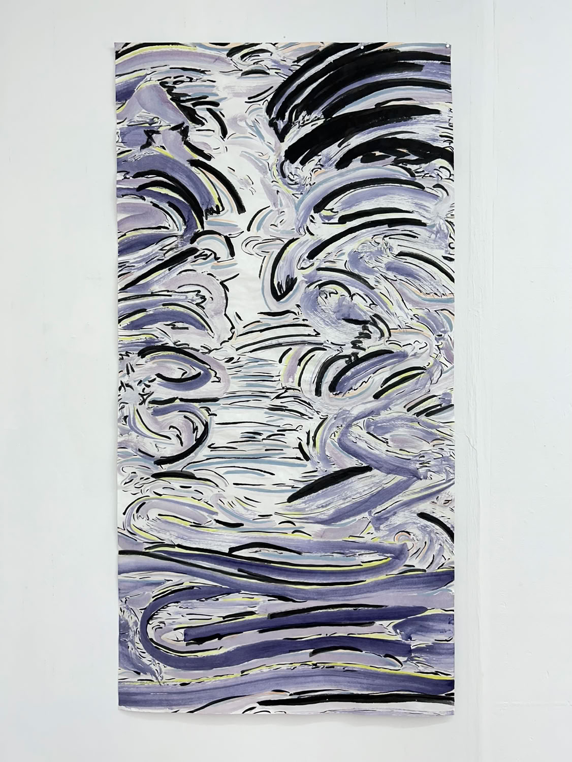Michael C. Noyes, based in Bellows Falls, Vermont, has long maintained an oil painting practice which has been influenced by the artist’s study of ink wash on paper, and of Chinese calligraphy and painting. The artist’s newest series, Water Way, evolved into using ink wash as a primary medium. The materials the artist uses include handmade Xuan and Mulberry paper of several thicknesses, each made respectively from the bark of the Blue Sandalwood tree, the Mulberry tree and leaves, and rice stocks, along with other ingredients and lengthy processes used for over a thousand years in China. Brushes consist of natural hairs, all with specific purposes, made for example from goat, sheep, rabbit, weasel, bear, and horse. The traditional ink sticks are composed of pressed powdered pigments bound with gelatin. These are ground with water on a stone to emulsify a thick ink.
