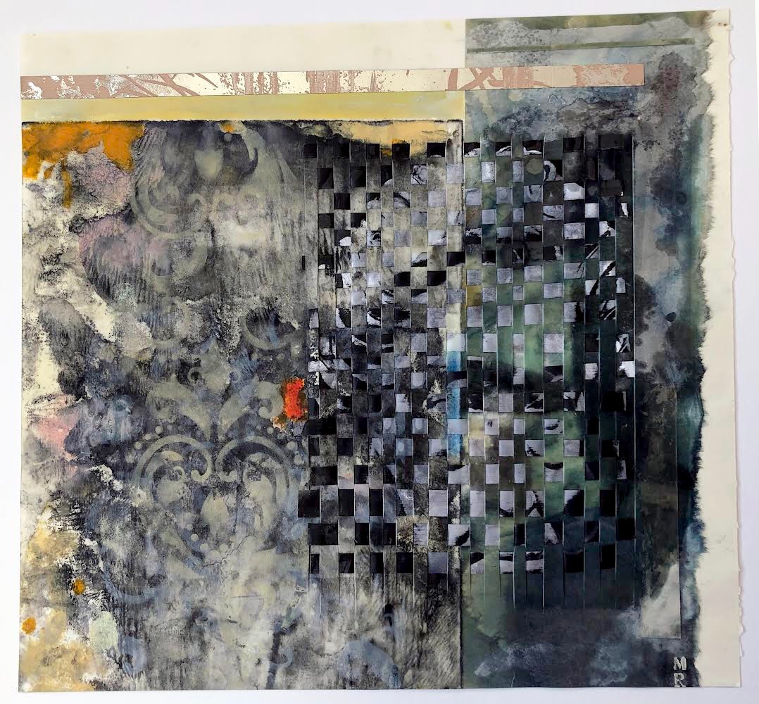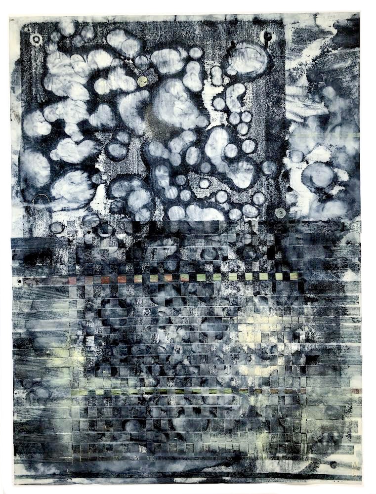 The MELISSA RUBIN Transitions solo show presents Woven Encaustic Monotypes, created in 2020-21. A monotype is a one-of-a-kind print. The artist paints on a printing plate and transfers it to paper with a press. Encaustic is a technique of painting with pigmented wax, often on wood panels, with many layers being separately fused or burned on. To create an encaustic monotype, the artist uses pigmented wax, applied directly to a temperature-controlled metal plate. Paper or fabric is then laid onto the hot wax, so that the image transfers and absorbs into it.