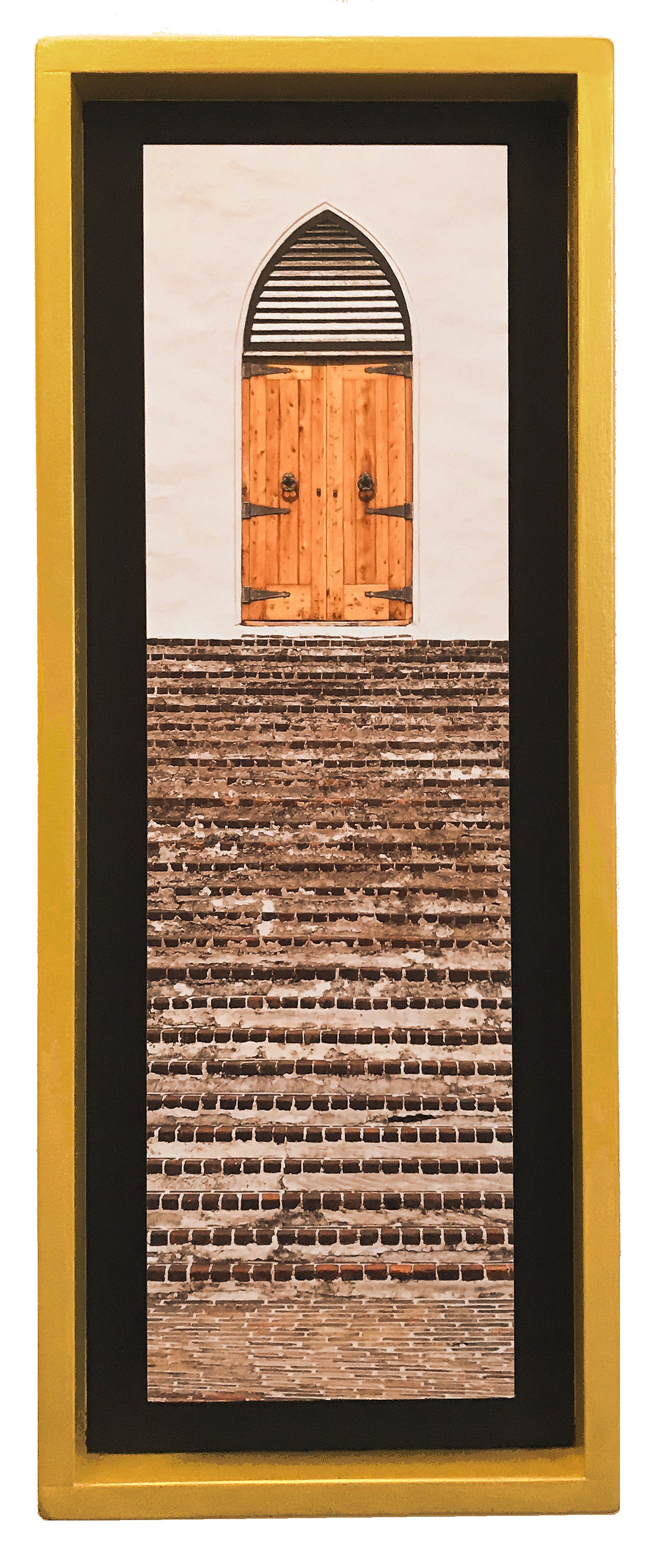 Clear-coated, digital print on medium density fiber board, mounted in a two-level float, set into an open shadow box
