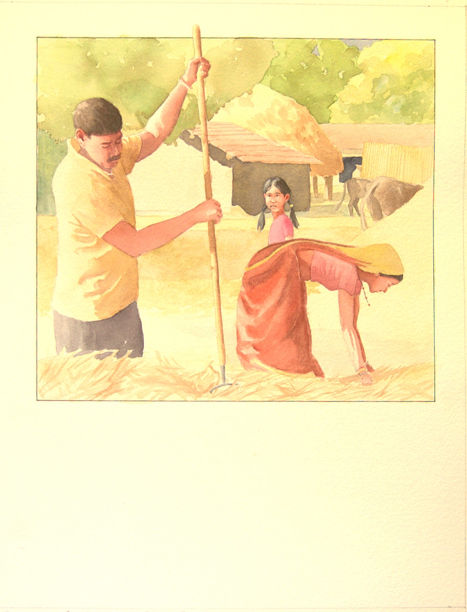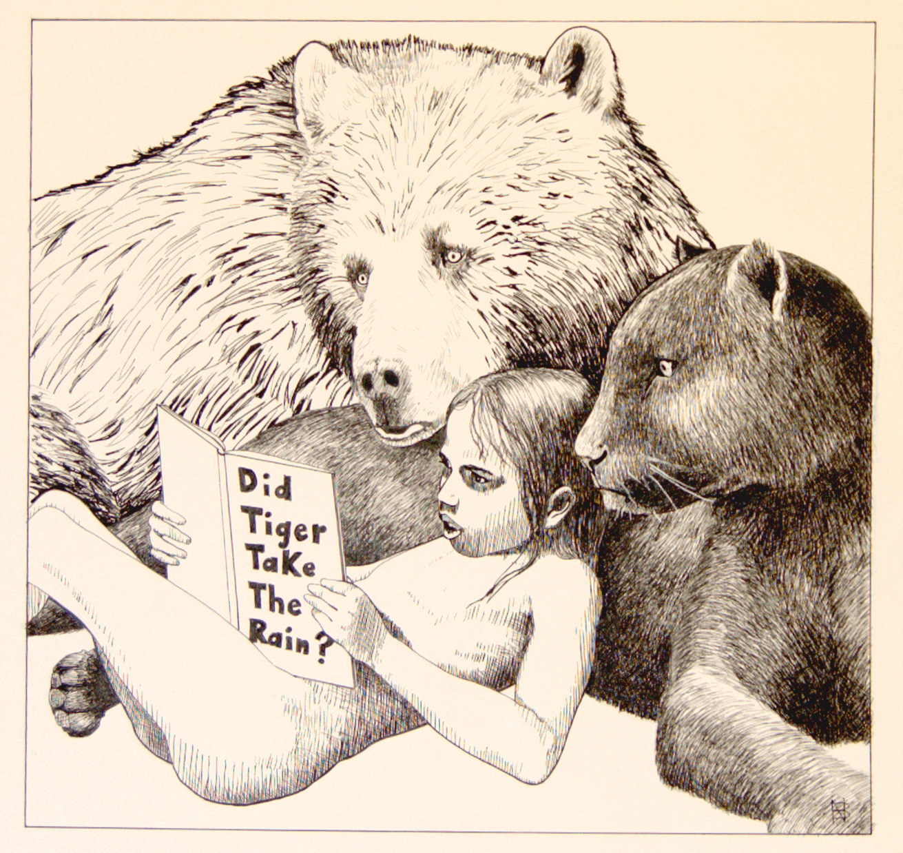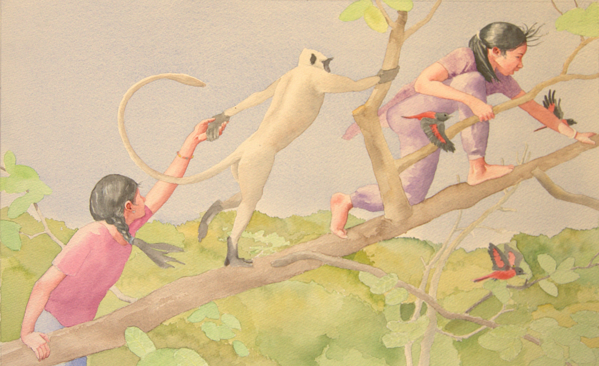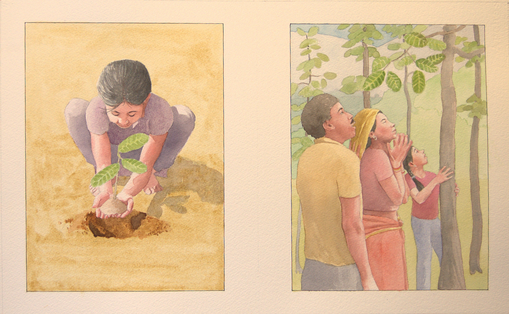 Charles Norris-Brown’s concerns for the endangered tigers and the villagers who live between the densely-populated plains of Uttar Pradesh, India and the hills of Nepal, is what first led him to turn to his Art. Norris-Brown uses his art as a means of communicating complex matters through visuals and story narratives. Through a close relationship with the Tharus peoples, Norris-Brown saw that deforestation and persistent droughts were creating severe conditions- devastating to the native plants and animals of the region, as well as for the peoples of the villages. To best protect the tiger and the people, during several journeys to India doing fieldwork, Norris-Brown created an illustrated children’s book to explain how their shared plight was caused by human-wrought ecological changes in the land. This area, known as the Terai, is a region that juxtaposes farms with wooded areas, including some of the best-known tiger reserves of India and Nepal. Now, Did Tiger Take the Rain? fulfills the artist’s mission through Pratham Books, originally conceived to “put a book in every child’s hand.” For the past fourteen years, utilizing modern phone and internet technology as well as traditional printed materials Pratham has translated and distributed over 30 million books to underserved, impoverished and remote communities in India.