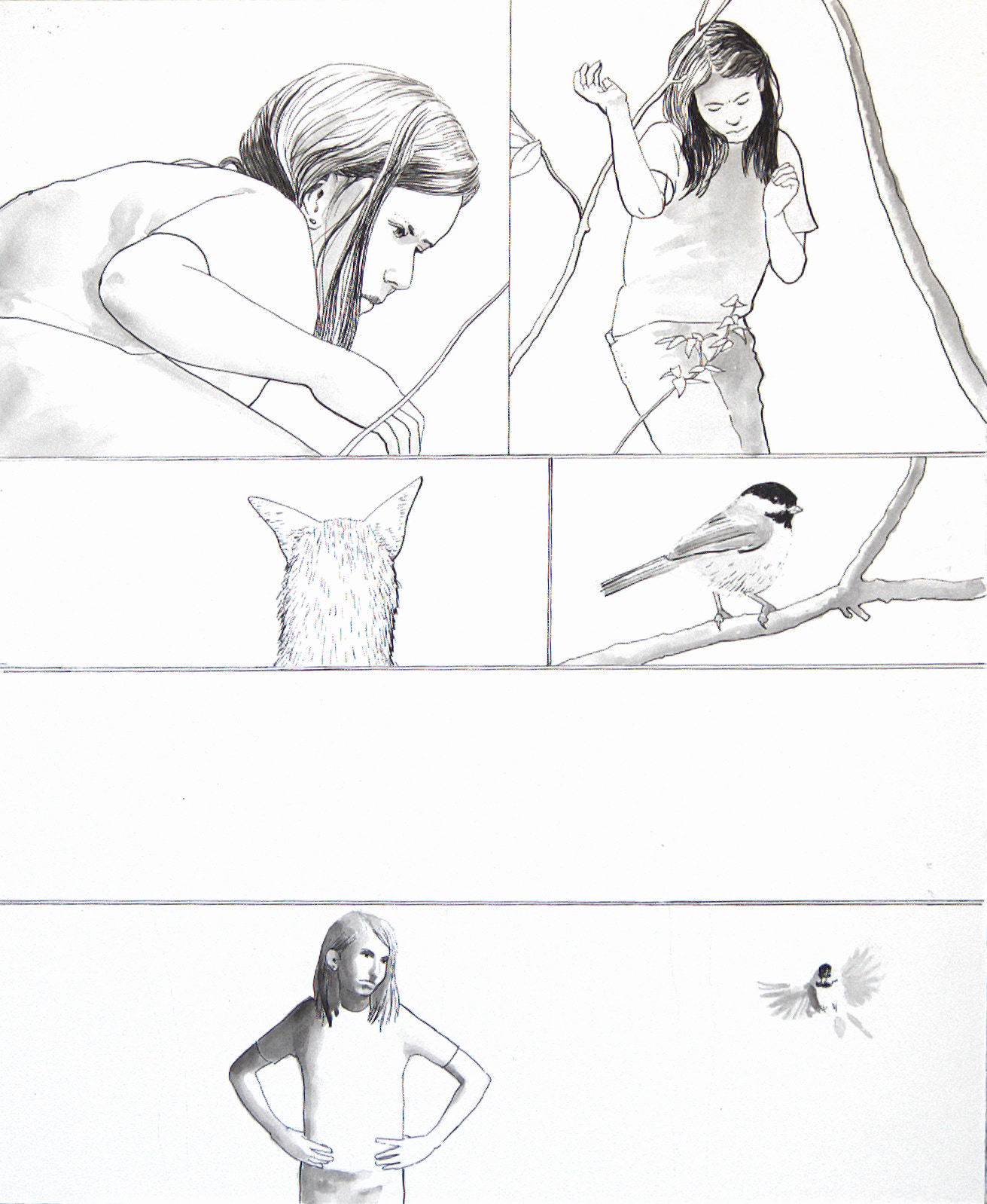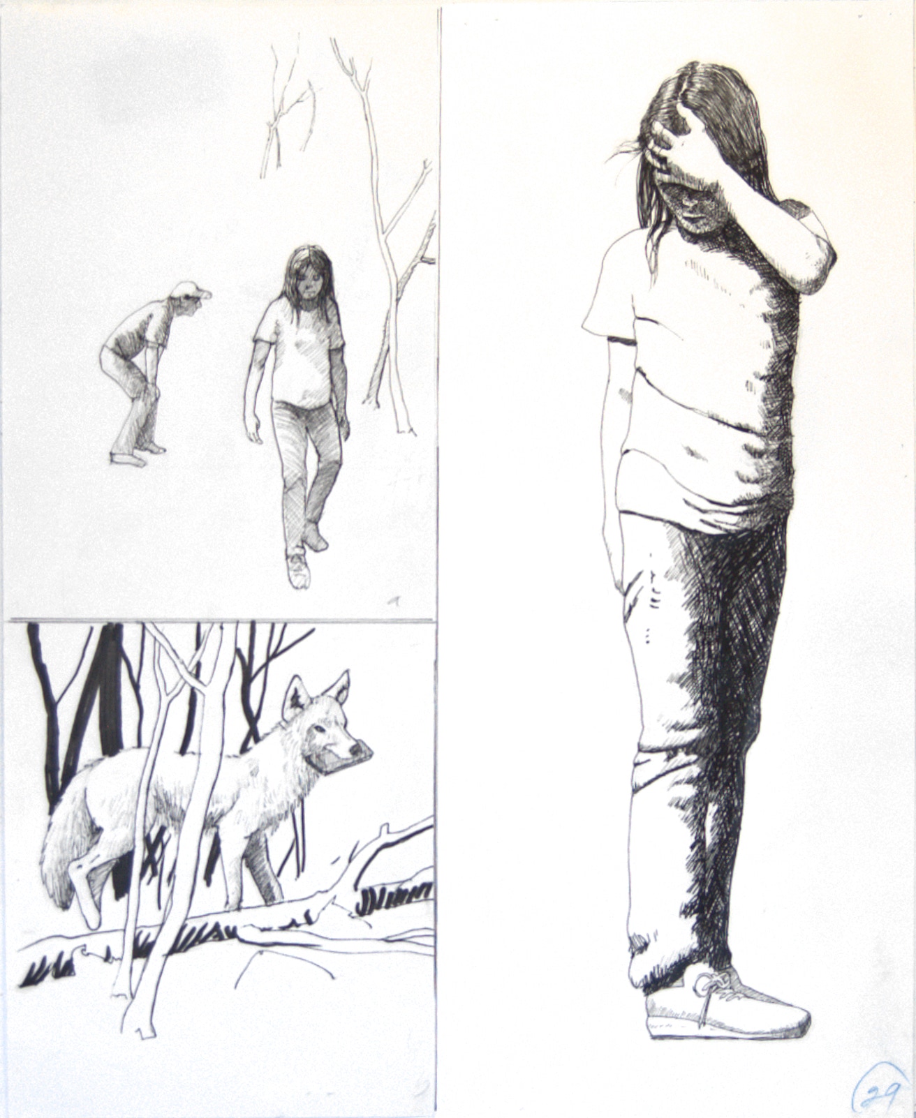 The artist’s second book, Thunder Basin, a graphic novel geared towards an older child reader, is a work in progress. LISTEN TO THE WIND shares a collection of studies and finished work in ink, watercolor, charcoal and mixed media, along with a selection of multi-celled, draft pages from the graphic novel offering a unique view of the artist's process in creating Thunder Basin. Here an American girl loses her beloved cell phone in the forest. Trickster Coyote picks it up and runs away with it—leading her to explore the forest, and ultimately, herself. This quest unfolds in the Thunder Basin along the west flank of Mt Mansfield, Vermont.