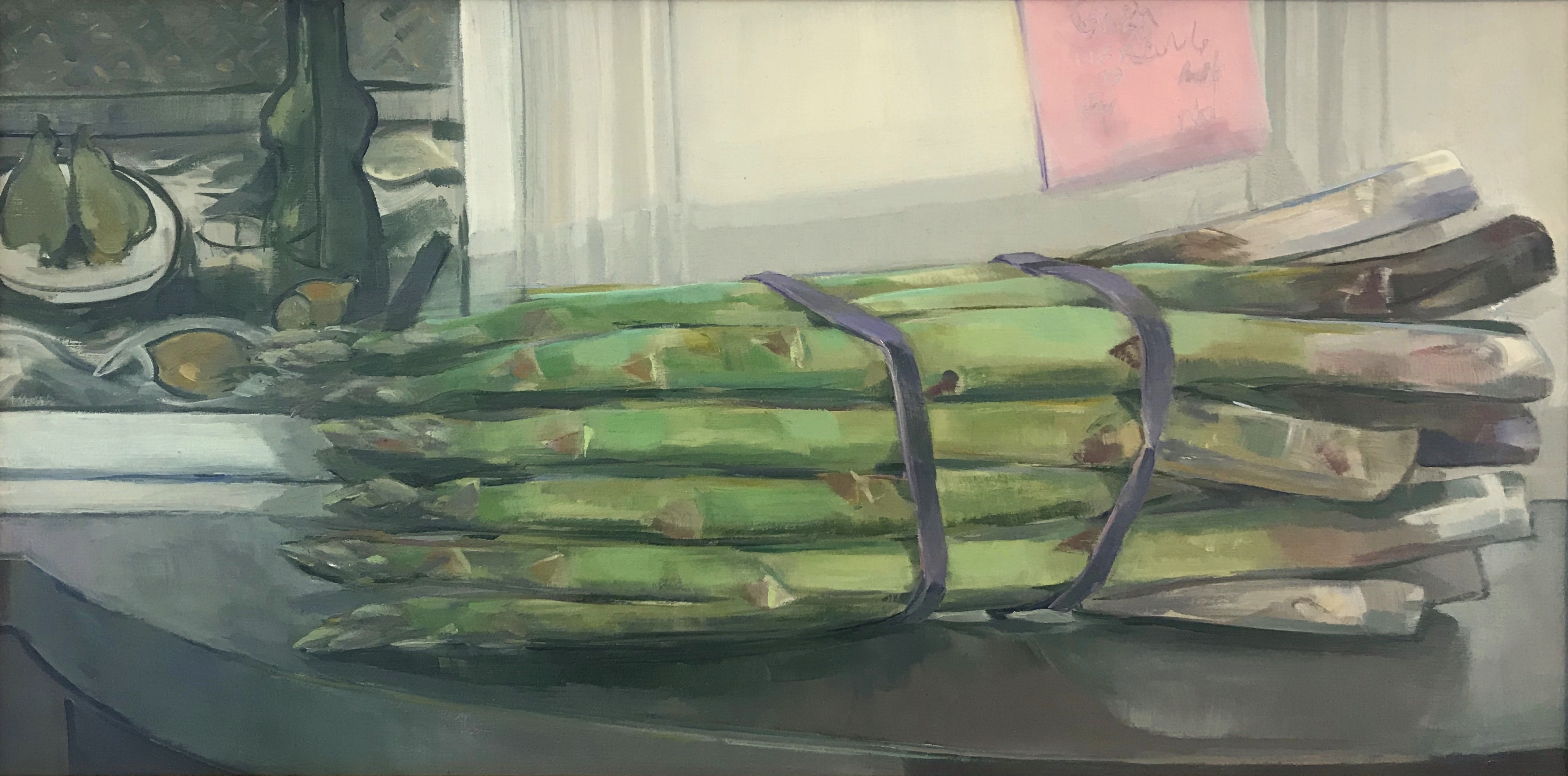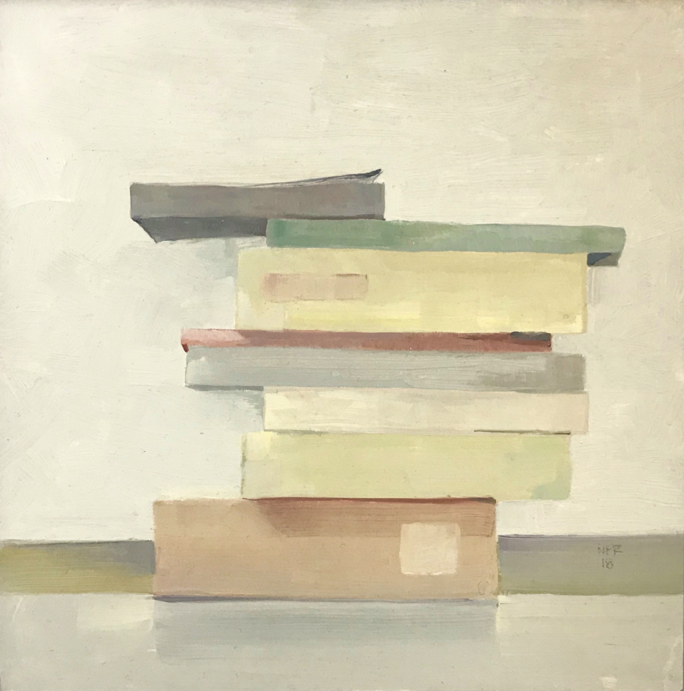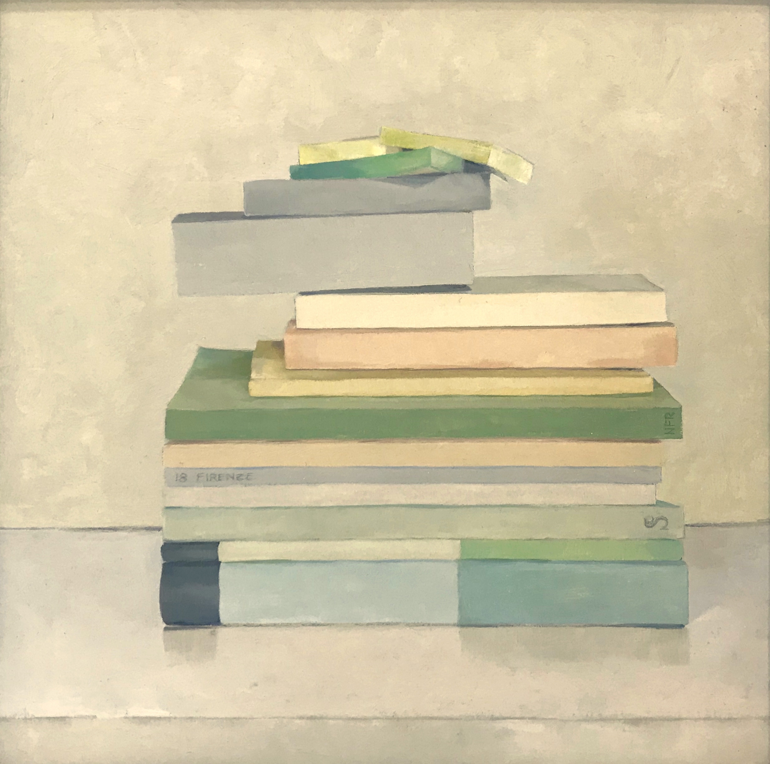 Nancy Fitz-Rapalje, based in Bellows Falls, Vermont, shares new oil paintings in her inaugural Solo Show at Canal Street Art Gallery. Nancy presents paintings from some of her familiar floral still lifes, fruits, and vegetables, done with her calculated, geometric style of brushstrokes. These new paintings focus on intimate details from the artist's life, with paintings depicting sticky-notes, origami, book stacks, color chips, and postcards showing reproductions of artworks from the likes of Braque and Duchamp. To reflect this unique view of the artist’s life, Fitz-Rapalje includes in the show quotes from other artists of importance, in a selection gleaned from decades of reading and saving in her numerous Commonplace Books.