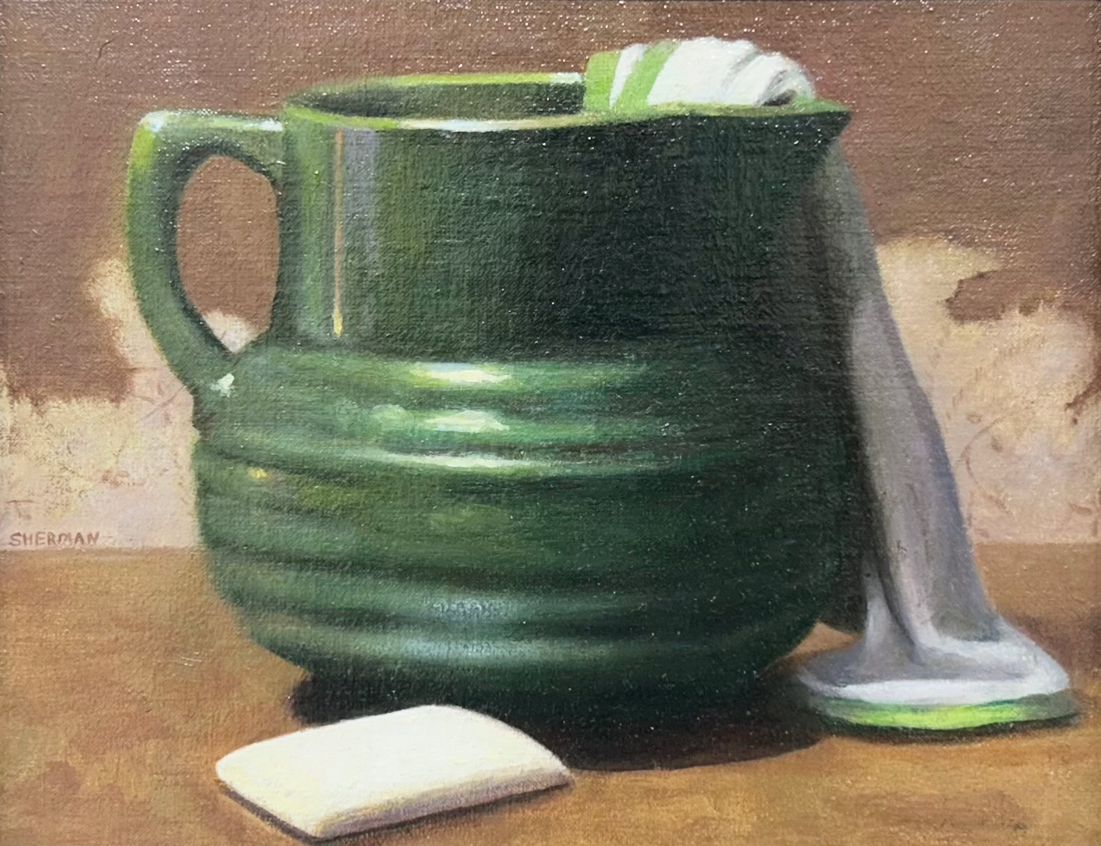 Sandy Sherman, based in Bellows Falls, Vermont, creates still life paintings using effects of light and color to portray tenuous scenes of everyday objects, vintage clothing and unique antiques. In this show, Sherman shares an oil painting of a green pitcher with a wet face towel draped on one side, and a freshly used bar of soap on the table, in this intimate 8 in x 10 in oil painting. Sherman is a native of New Hampshire, and has been painting in the traditional manner since 1980. The artist studied for three years with Richard Whitney where she learned the basics of classical realism. She also studied with Debbie Crowder and Peter Granucci. She is a member of the Keene Art Association, Copley Society of Boston, Women's Caucus For Art, Academic Artist Association, and the Catharine Lorillard Wolf Art Club, Inc.