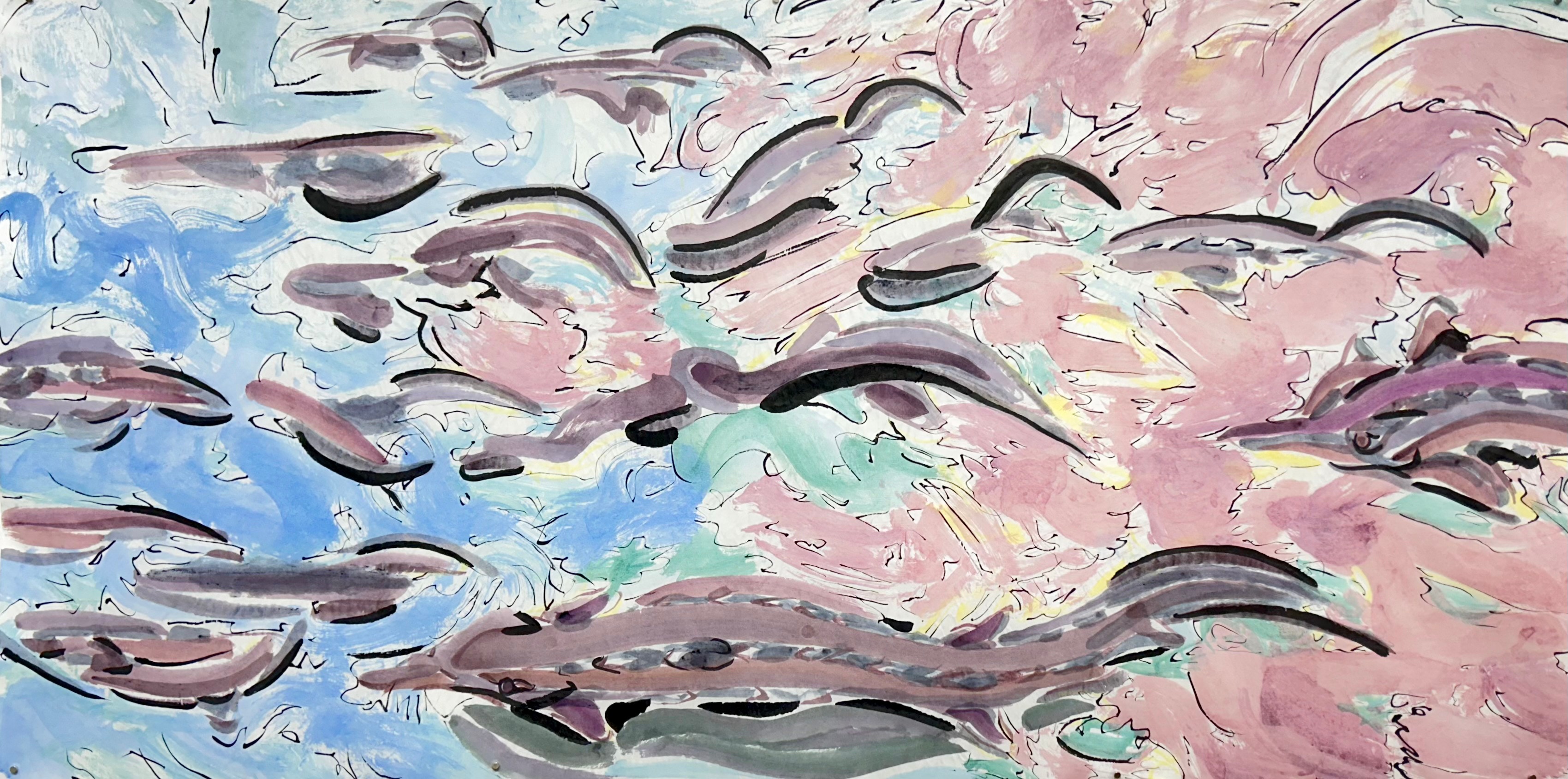 watercolor, pigment ink, Prismacolor marker, Posca pen, embroidery thread, collage