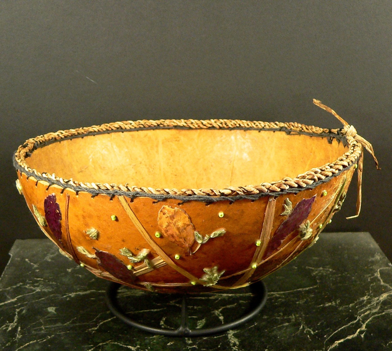 Mixed media encaustic with day lily leaf cordage on cannonball gourd