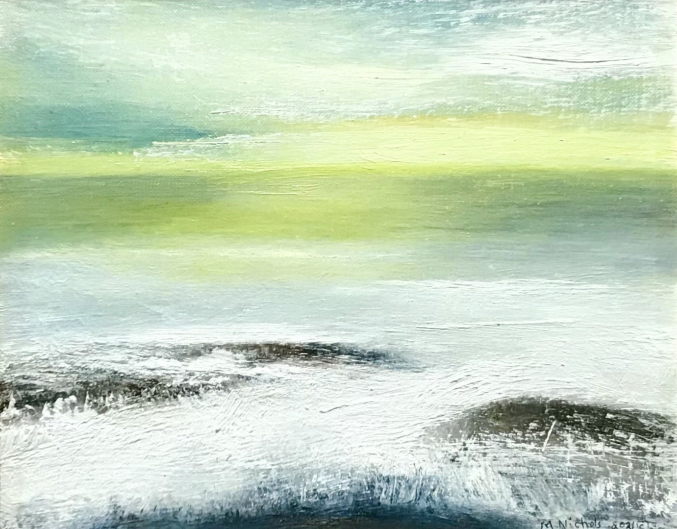 “Color, light and more recently, sound are my primary interests. We are surrounded by ever changing light, color and sound as we go about our days in the landscape. I explore the vast variety of colors which I can mix, and their interactions with each new painting. The elements of the landscape or sky are used as a foundation for the design of each piece. It evolves from there until I am satisfied that some sense of glowing color has been achieved. My interest in obtaining a glow of color really comes from my meditation experience. Light and color in the landscape ultimately act as metaphors for inner exploration, as I continue to grow through meditation.” -Martha Nichols.