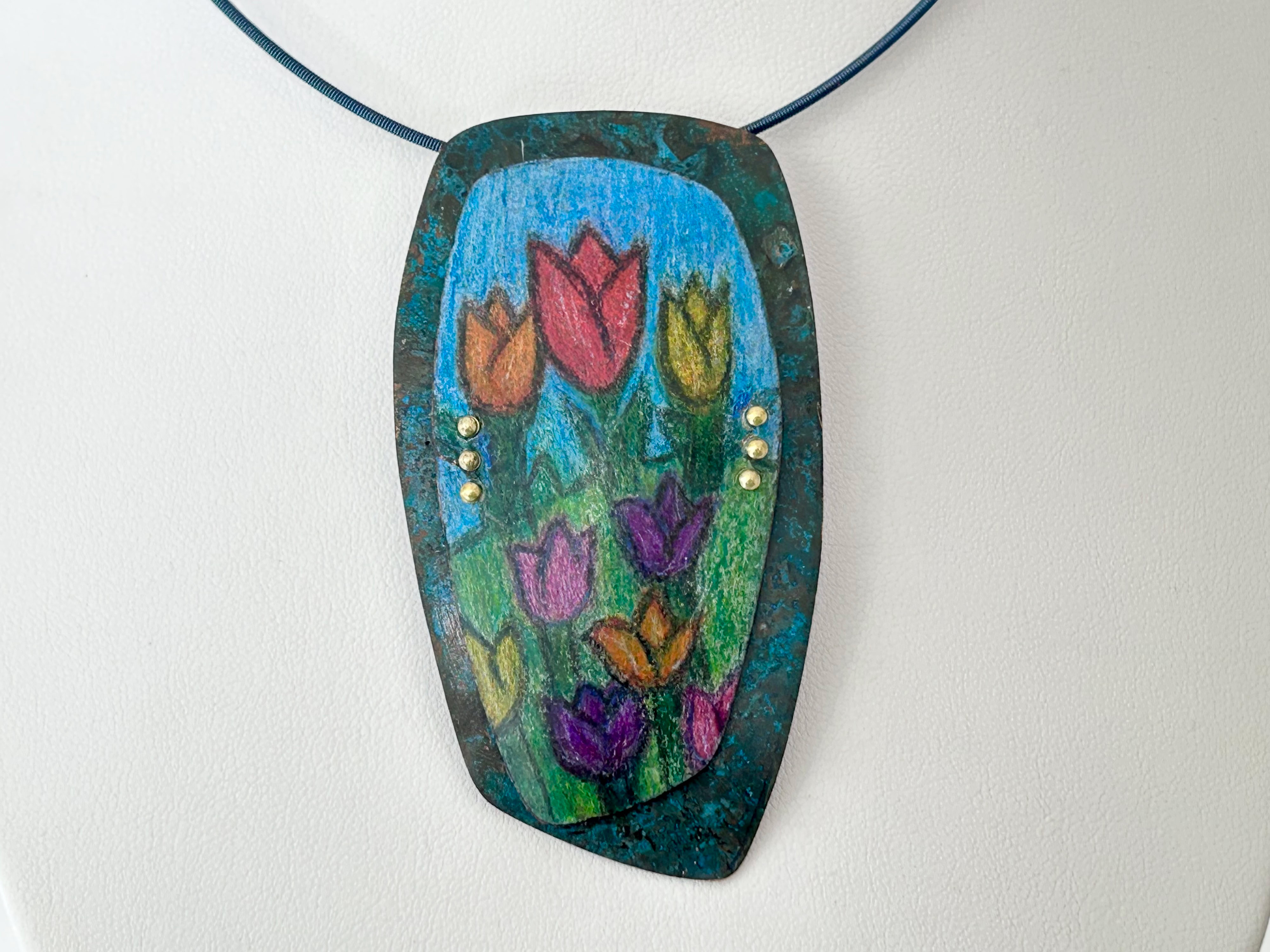 colored pencil on copper riveted to copper with patina